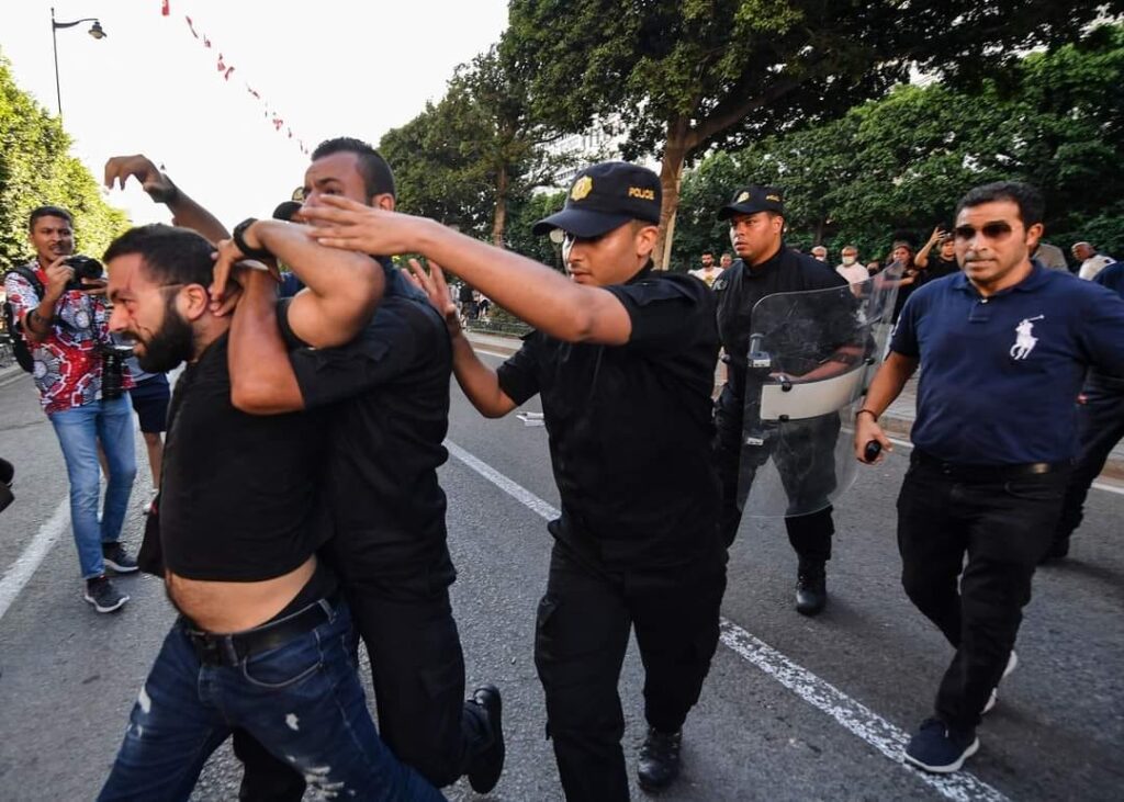 On July 22, thousands of Tunisians protested on the streets against the authoritarian actions taken by President Kais Saied to consolidate power and undermine the achievements of the 2011 revolution. Their just protest was responded to with violent and brutal repression by state security forces who charged at protesters with batons, sprayed tear gas at them, and arrested nine. Several were also hospitalized due to injuries.